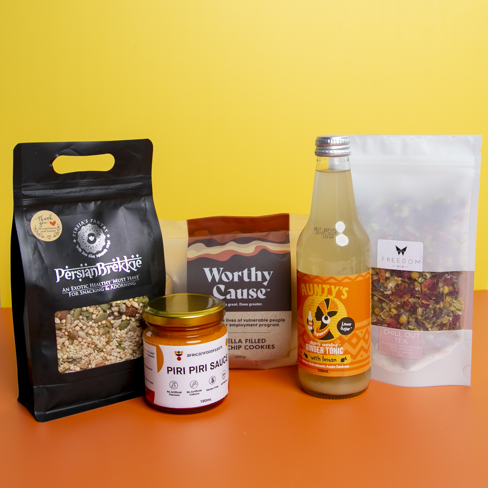 TREAT YOURSELF! You’ll get a delicious jar of African Feast’s Piri Piri Sauce, a 37g of Freedom Hub’s Herbal Chillout Tea, 1 bottle of a refreshing Aunty’s Ginger Tonic (non-alcoholic, choose from lemon or tamarind) and a gluten-free and sugar-free Persia’s Pantry Brekkie Pouch. You’ll also get delicious, gooey Worthy Cause Nutella Choc Chip cookies. Eat good, feel good!